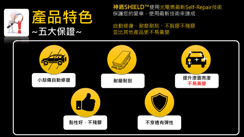 SHIELD™犀牛皮擁有:高科技自修復技術、耐磨耐刮、提升漆面亮度、黏性好不殘膠、不穿透有彈性等五大保證,保護您的愛車不受外在因素損傷